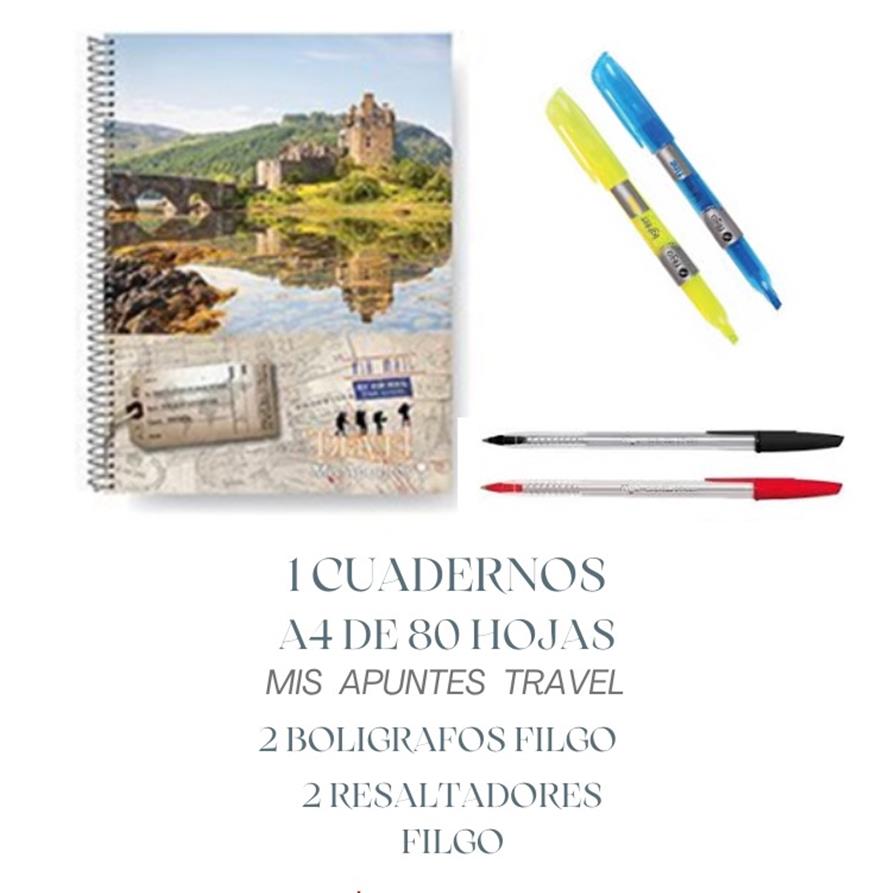 1 cuaderno A4 80H + 2 bolígrafos + 2 resaltadores